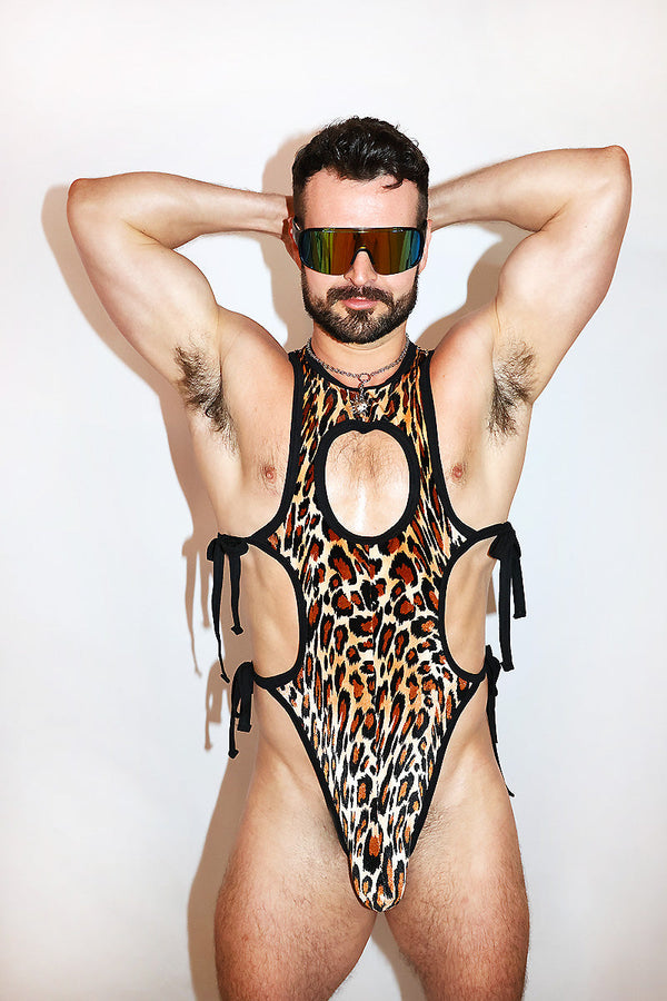 Leopard Brush Velvet Cutout Rib Knit Tied Up Bodysuit- Black