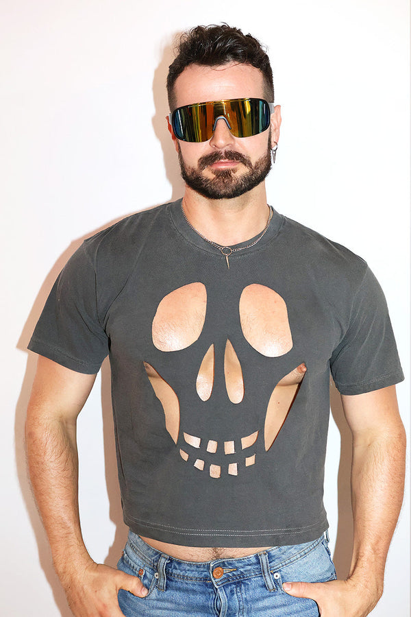 Skull Cutout Vintage Oversized Box Crop Tee- Black