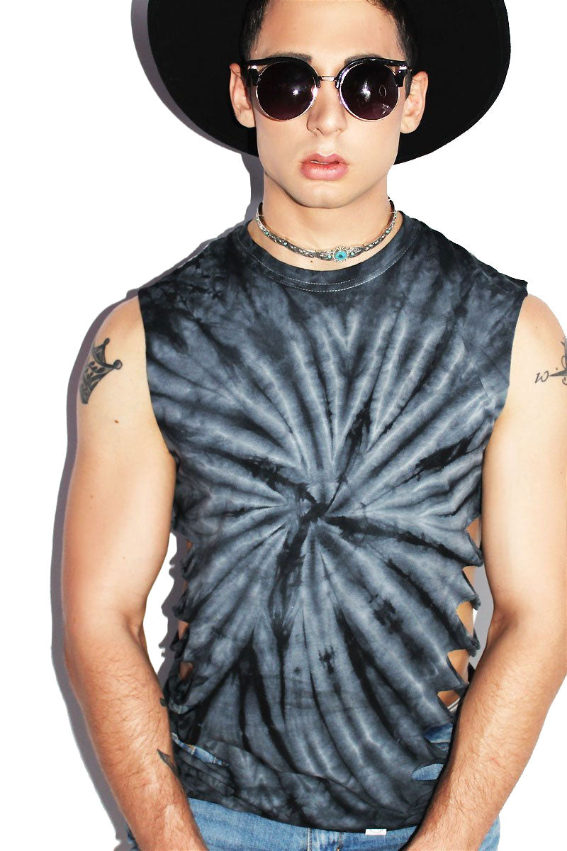 Shredded Oblique Tie Dye Sleeveless Tee-Black