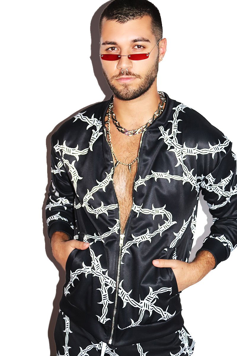 Barb Wire All Over Print Bomber Jacket-Black